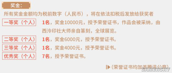 本届赛事为优胜者准备的奖励更是无比丰厚,前十名均可获得腾讯亲授的荣誉证书。最终的冠军除了获得10000元的现金大奖,更重要的是其设计作品将由西泠印社的非遗大师进行亲自篆刻,让大家看到中华传统文化的结晶与智慧。