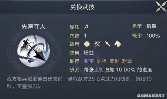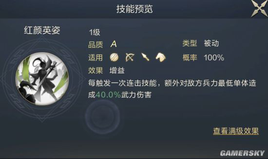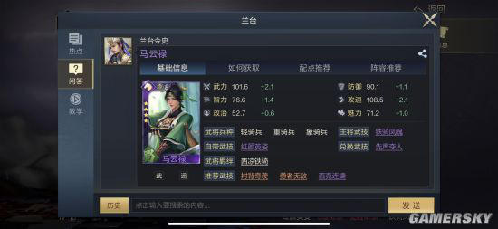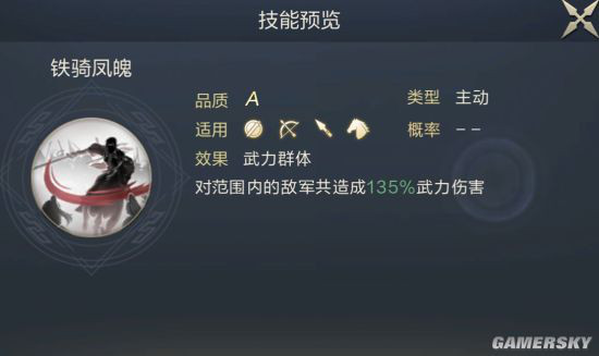 马云禄一句话简评物理型武将,高攻速。触发连击技后可对敌方最低兵力武将造成额外武力伤害。需配合连击技能使用。
