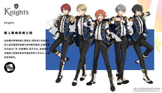 骑士道组合Knights由朱樱司、月永雷欧、濑名泉、朔间凛月、鸣上岚五位美少年组成,他们像是不同的风格的骑士,为你带来充满魅力的舞台表现。