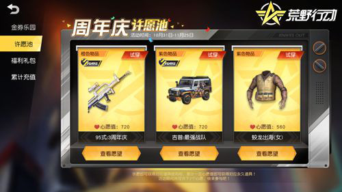 周年庆许愿池开启,永久道具随心领!10月31日至11月25日,许下心愿累计心愿值即可获得95式:3周年庆限定橙品、吉普:最强战队等永久道具!快来查收属于你的心愿奖励吧!