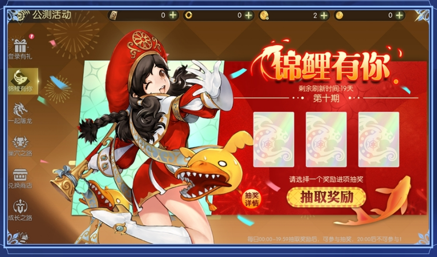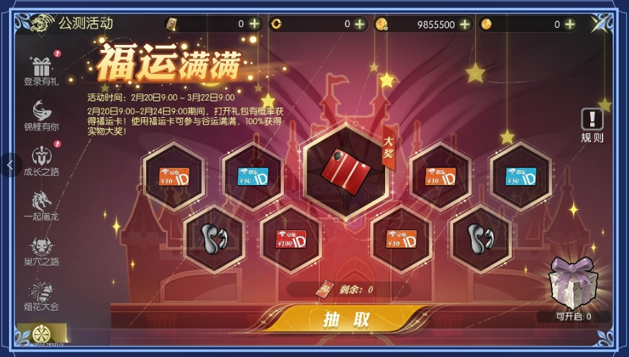 每日登录可获得惊喜奖励和随机中奖码,中奖码将在每日20:00进行开奖。