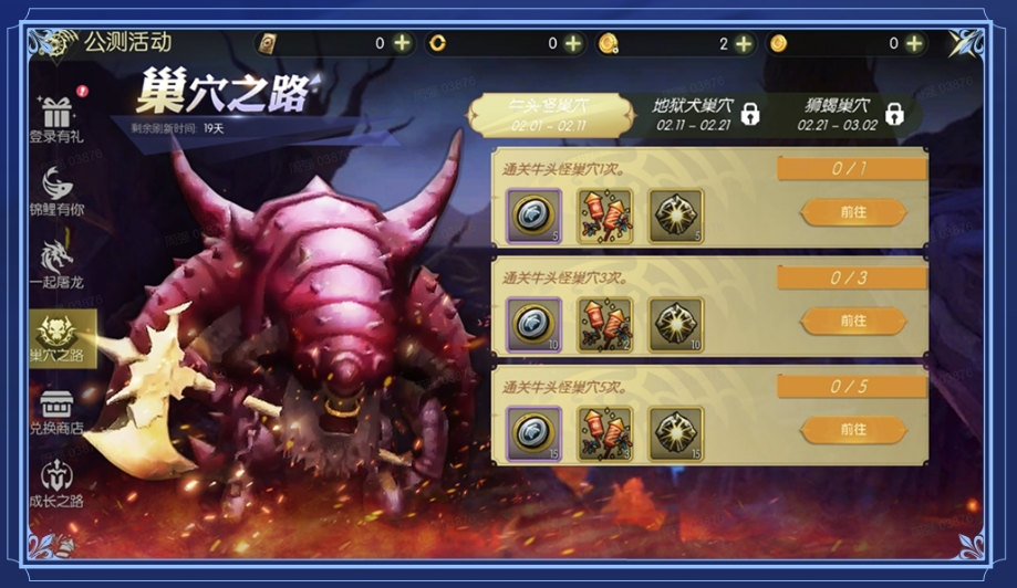 完成牛头怪巢穴、地狱犬巢穴(经典/地狱/挑战)、狮蝎巢穴(经典/地狱/挑战)通关条件,可获得梯度奖励。