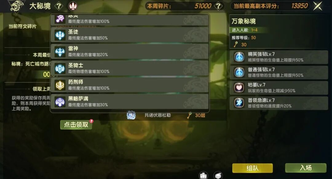 13. 部分二转职业在 “试炼塔困难模式” 及 “大秘境” 玩法中新增了BUFF效果加成(最终物理/最终魔法伤害加成),无需领取等操作,进入对应的副本场景后即可生效(具体截图见下图,以实际上线为准);