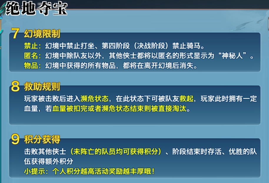 被队友救起依然可以继续参与活动;当