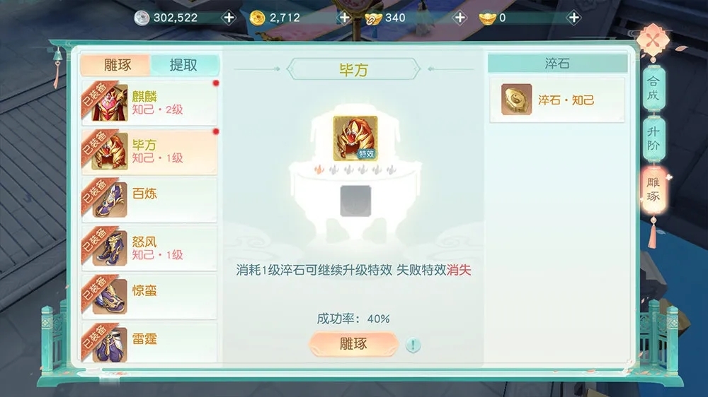 淬石不多的情况下,雕琢到1级就行。淬石升级的成功率低,比较看运气,一旦失败特效就会消失,提升的战力就一转眼又降啦。