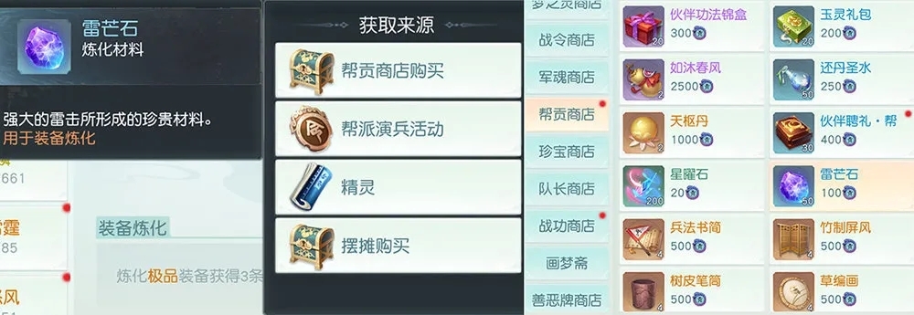 雷芒石只有在周二19:50-20:40这不到一个小时的帮派演兵活动中可以获得,另外也可以在帮贡商店、队长商店、战功商店购买或者摆摊购买。