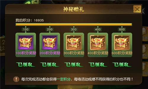 值得一提的是,每次完成活动都会获得一定积分,而每场活动成绩不同获得的积分数量也不同!当积分达到一定数量时即可领取对应的积分奖励哦~