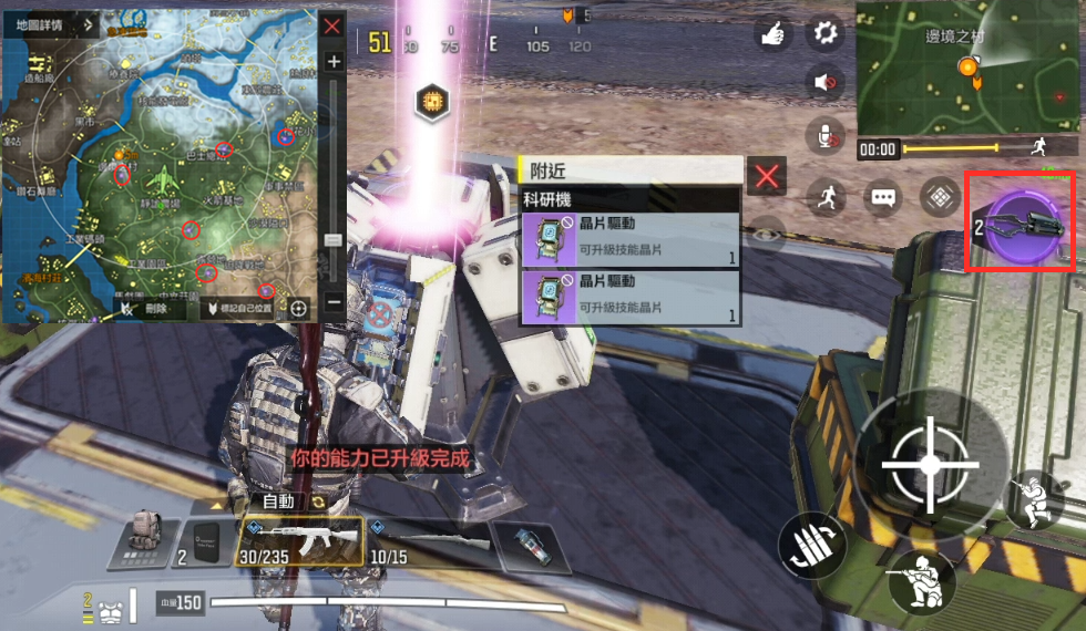在地图中红色圆圈圈出来的紫色小点是科研机所在的位置,我们在科研机这里可以升级晶片技能。一个科研机中有四个晶片驱动,也就是可以升级四个人的晶片。当然了,这个晶片驱动是不可以装备包带走的。