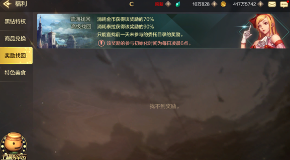 福利中的奖励找回也是需要用到泰拉的,如果我们前一天没有获得委托目录中的奖励,一些比较重要的奖励是可以用泰拉找回的。需要注意的是,金币只能找回70%,而泰拉可以找回90%,所以一些稀缺的材料推荐用泰拉找回。