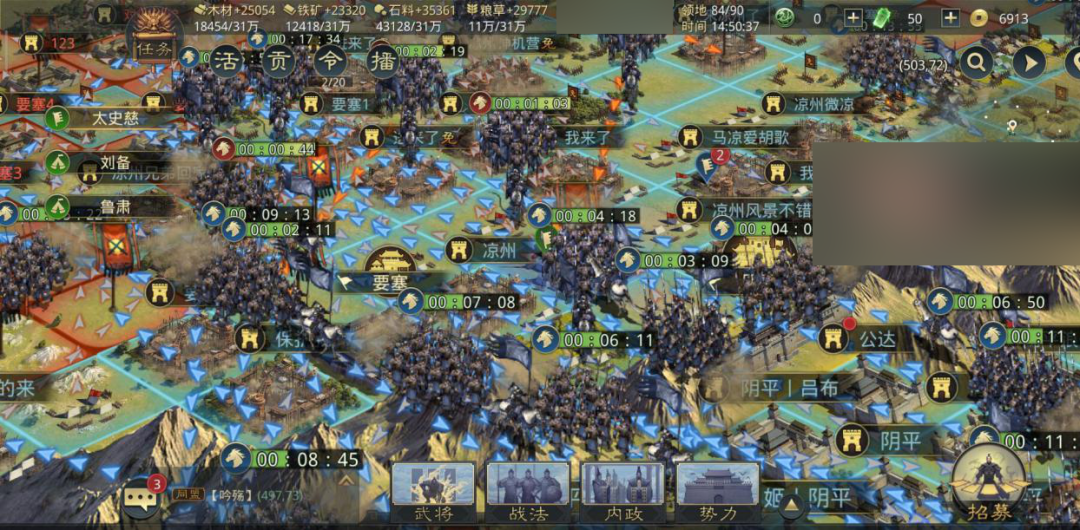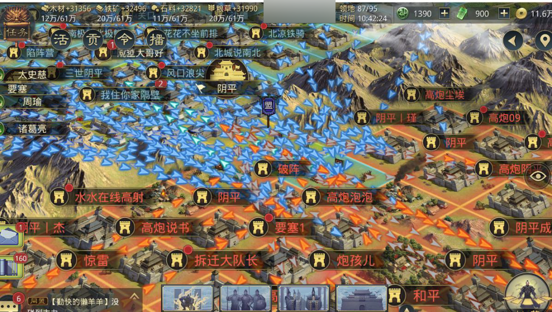 1870区丨荆扬征战,益州吞凉1870区,益州【潜龙在渊】率先出兵占领关卡凉益关卡阴平,拉开本区州战序幕。凉州在阴平关卡处并未设防,益州攻下阴平后直接铺路临羌。而冀州攻破青冀关卡广宗后,却遭到青州【魔战九州】建立要塞防线的猛烈反攻,关卡广宗被青州强势夺回。南方的荆扬二州也是在相互攻伐,扬州【和率土说晚安】发兵占领荆扬关卡夏口,而荆州【聖丶戰門】则是出兵攻占荆扬关卡赤壁,双方在赤壁关卡屯兵对峙。 作为同盟霸主的扬州另一路北上攻占徐扬关卡武进,飞地凌县打城收服徐州。而联合凉州后的益州势力再次进行扩张,先是发兵攻占荆益关卡油江,意图争取荆州,随后相继破关雍州关卡葭萌、凉并关卡中阳,大有席卷天下之势。@千寻
