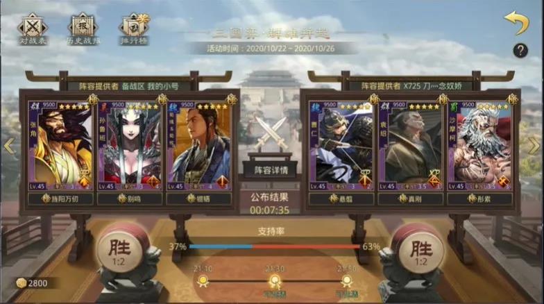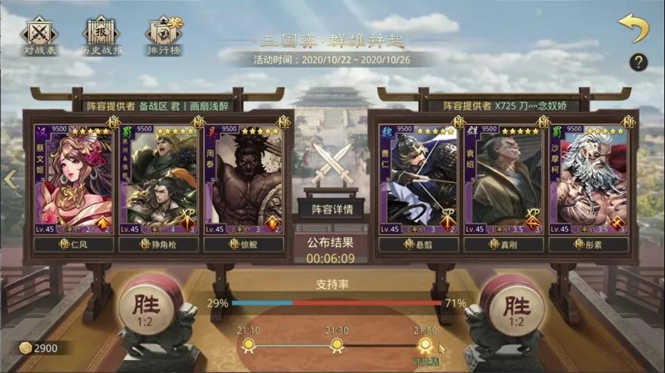第2场半决赛对阵双方为张角、孙鲁班、荀彧&荀攸及沙摩柯、袁绍、曹仁。