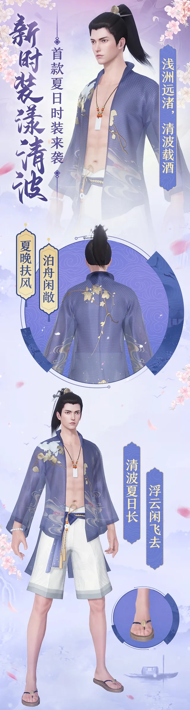 全新时装——漾清波在今天正式与大家见面,此次新时装有男、女两种款式,而女装款更加细致的分为少女款及成女款。往下滑动随明月菌来看看新时装细节吧!
