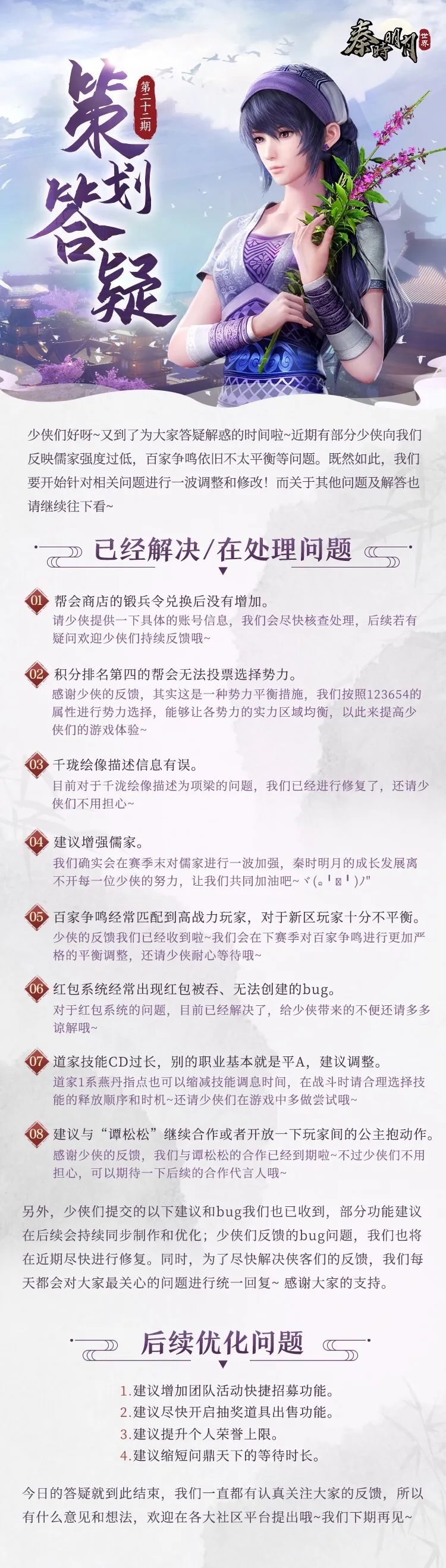 在本期的策划答疑中,关于儒家强度过低,以及百家争鸣不太平衡等问题进行了优化,快来下滑查看更多详情内容吧~
