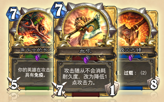 武器卡可以为英雄装备武器,使英雄具备更强的攻击力。武器在装备后即可使用,英雄在使用武器进行攻击时,将同样受到目标敌人的反伤害。
