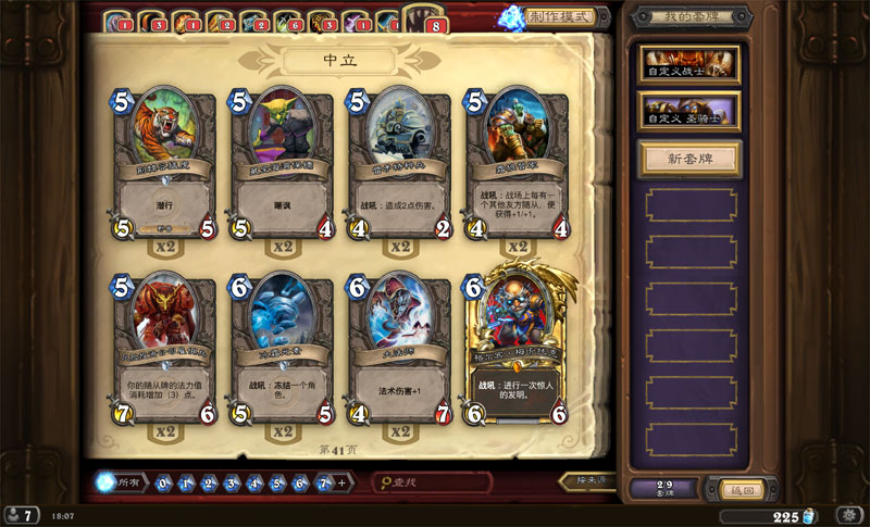 你可以在我的收藏中利用已有卡牌来自由组合你的套牌。组牌前,你需要先选择一个英雄职业。系统最多可以保存9组套牌,你可以随时改变这些套牌中的卡牌,也可以随意删除某个旧的套牌或创建新的套牌。