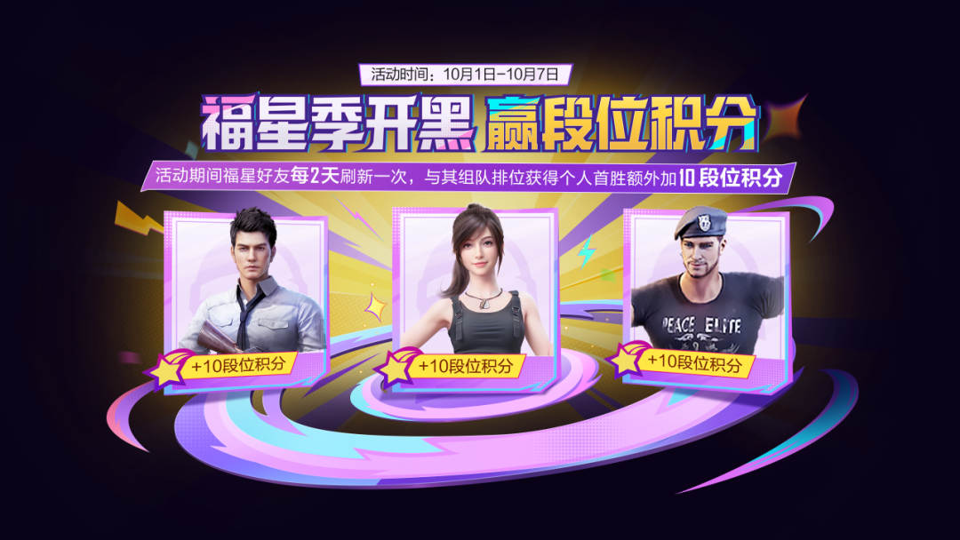 10月1日-10月7日,福星好友每2天刷新一次,与福星开黑获得个人首胜,可额外加10段位积分!