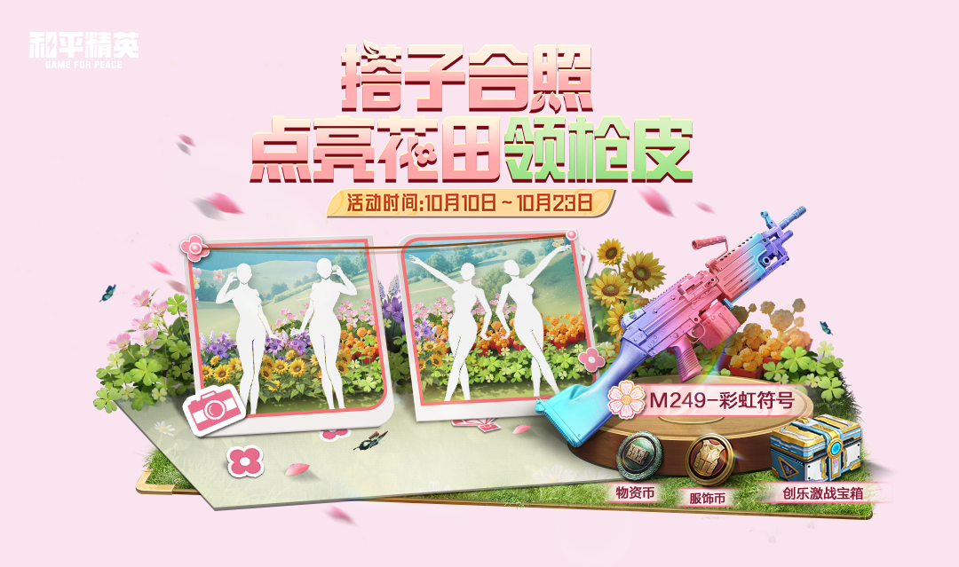10月10日-10月23日,完成与推荐的玩家合照/点赞/组队等任务可领取随机花朵用于布置花田,同时获得花朵对应的进度值,花田点亮进度达到指定数值可领取M249-彩虹符号、物资币和服饰币等奖励。