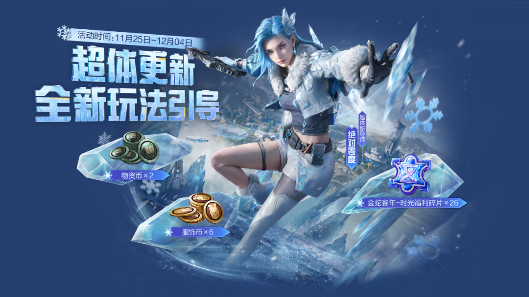 11月25日-12月4日,完成新版本任务可获得特训值,累计特训值可领取:金蛇赛年-时光福利碎片×8、服饰币×6、雪战到底宝箱×2、雪战到底头像框等奖励!