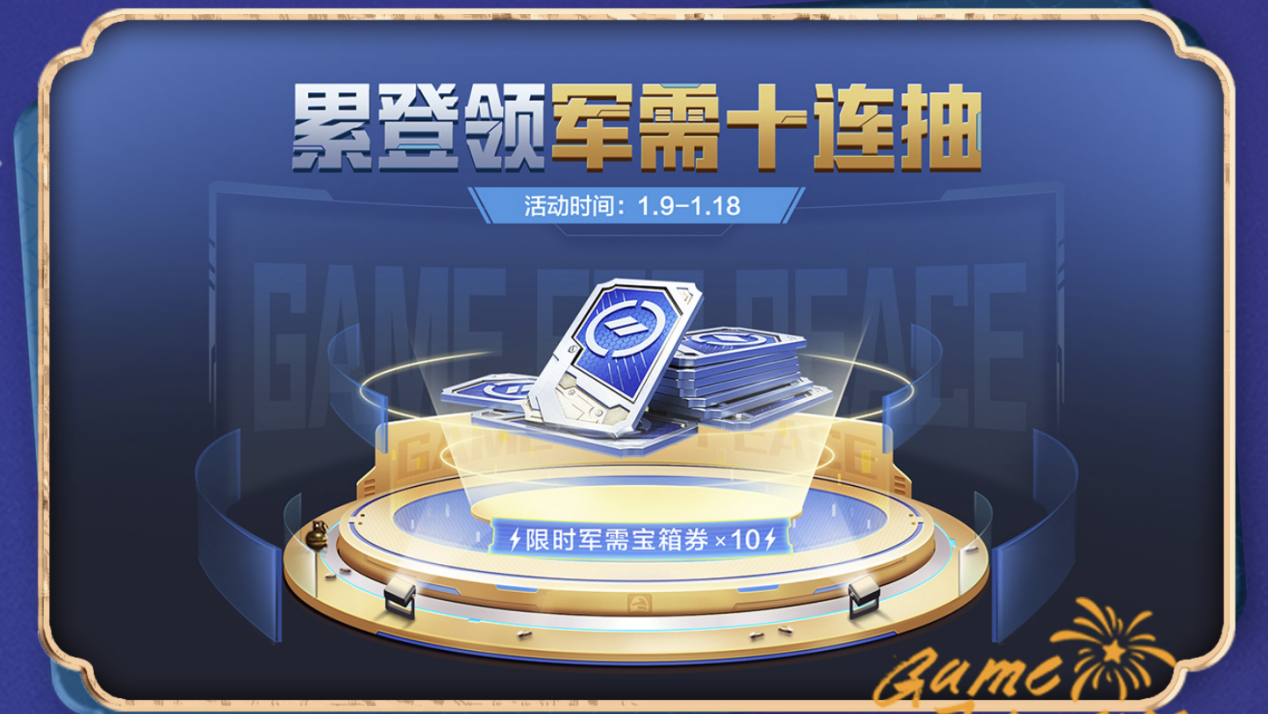 1 月 9 日 - 1 月 18 日,军需十连抽福利重磅上线!特种兵们每日登录即可领取限时军需宝箱券 ×2,活动期间最多可攒够 10 张,直接开启十连抽惊喜,稀有皮肤、实用道具等你来抽,零氪金也能享欧气!