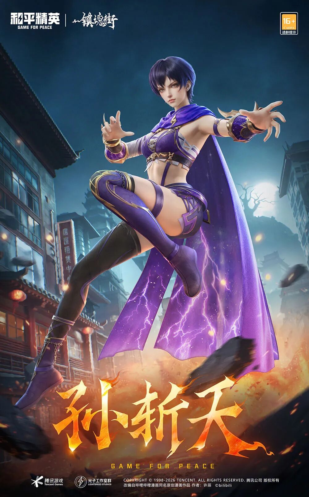 孙斩天闪亮登场!古风甲胄融现代剪裁,紫金配色迸发雷电爆发力!墨紫碎发配犀利眉眼,大姐大不羁神韵拉满;露腰内搭搭飘逸坎肩,尖刺护臂尽显破坏力;过膝装甲护腿稳下盘,雷电主宰蓄势待发!