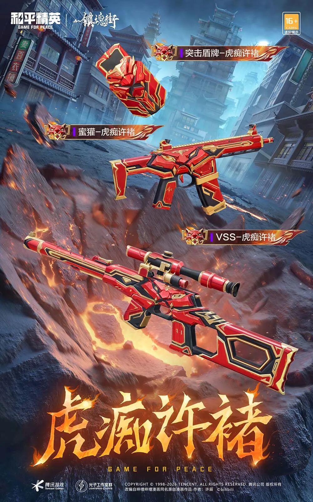 不仅如此,M24-虎痴许褚、蜜獾-虎痴许褚、VSS-虎痴许褚三款枪械皮肤,以及突击盾牌-虎痴许褚同步上架。