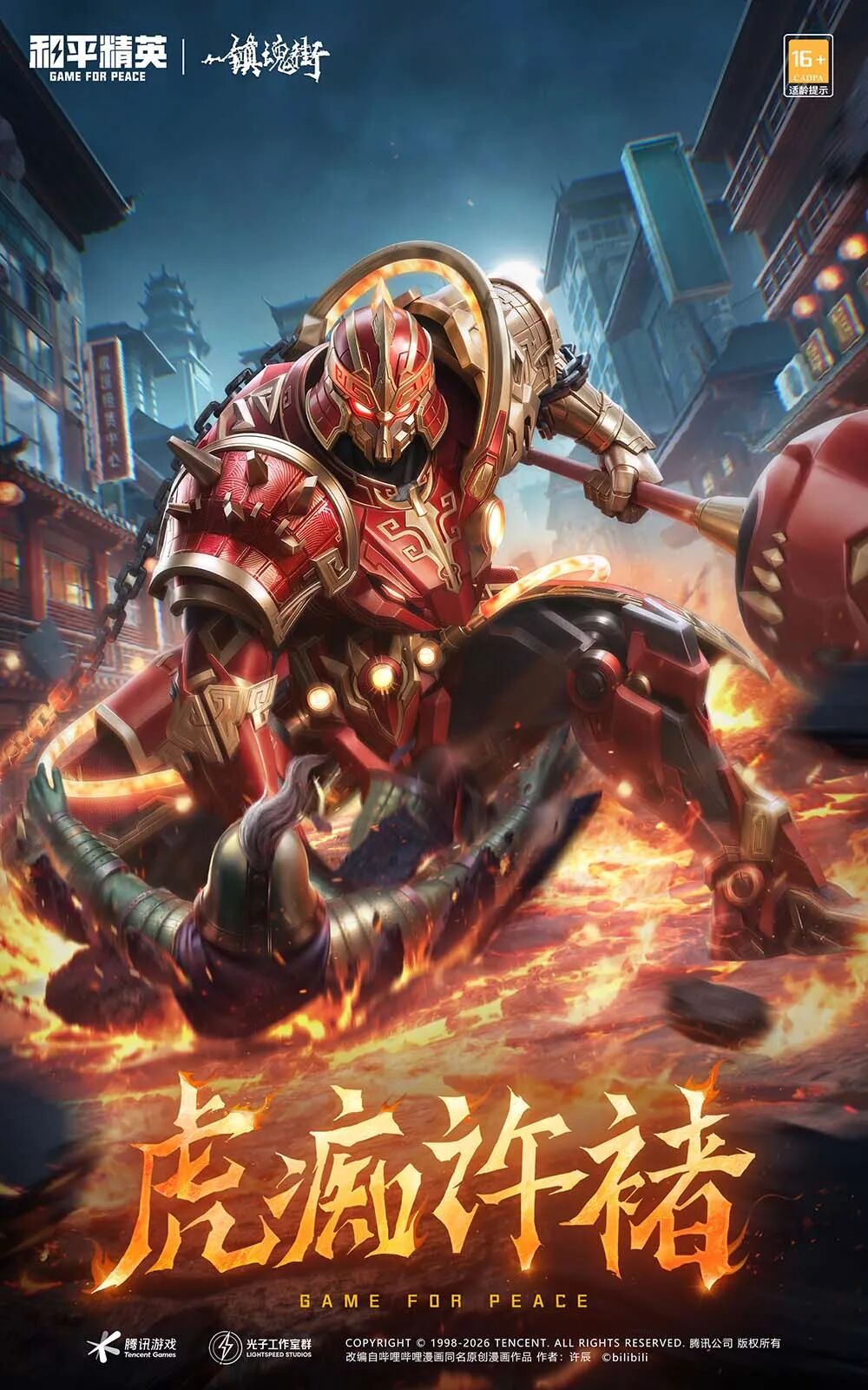 虎痴许褚霸气登场!曹魏猛将化身赤色钢铁堡垒,自带超强压迫感的守护神形象拉满!赤袍融未来装甲,胸甲化机械虎首,炽热虎瞳震慑全场;厚重胫甲战靴筑钢铁防线,以绝对坦度守御队友,硬核坦度天花板!