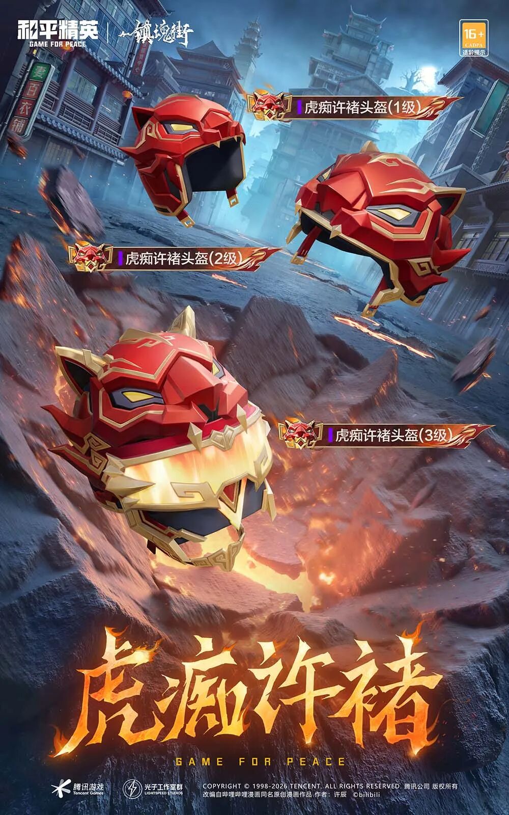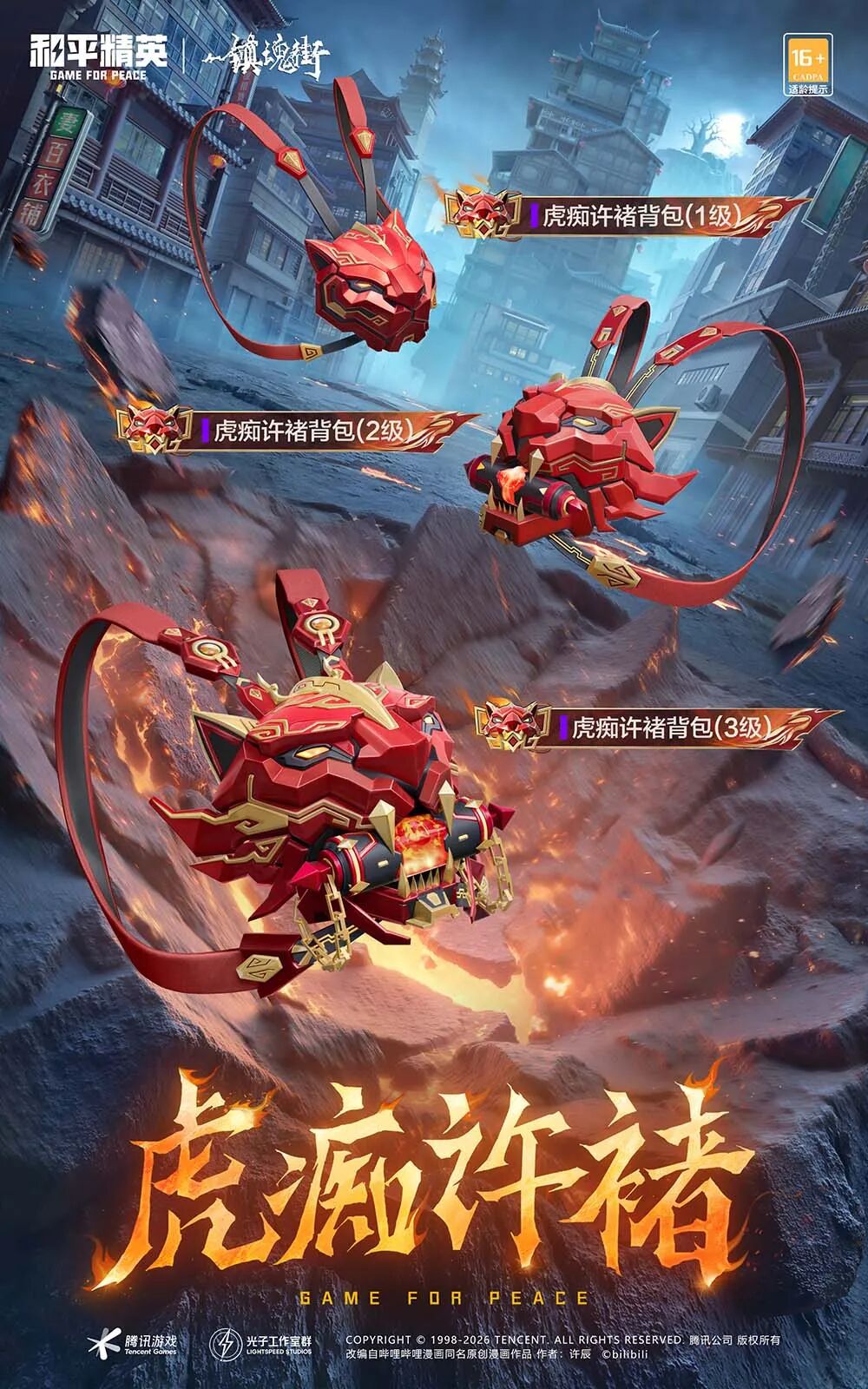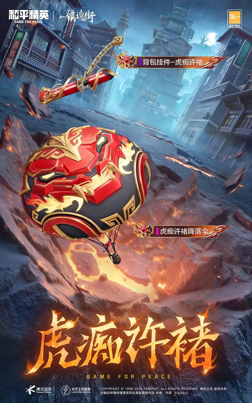 惊喜加码!此次联动还推出系列道具皮肤,一站式拉满热血装备格调。道具涵盖虎痴许褚头盔、虎痴许褚背包、背包挂件-虎痴许褚、虎痴许褚降落伞,每一款都深度融入虎痴许褚的经典元素。