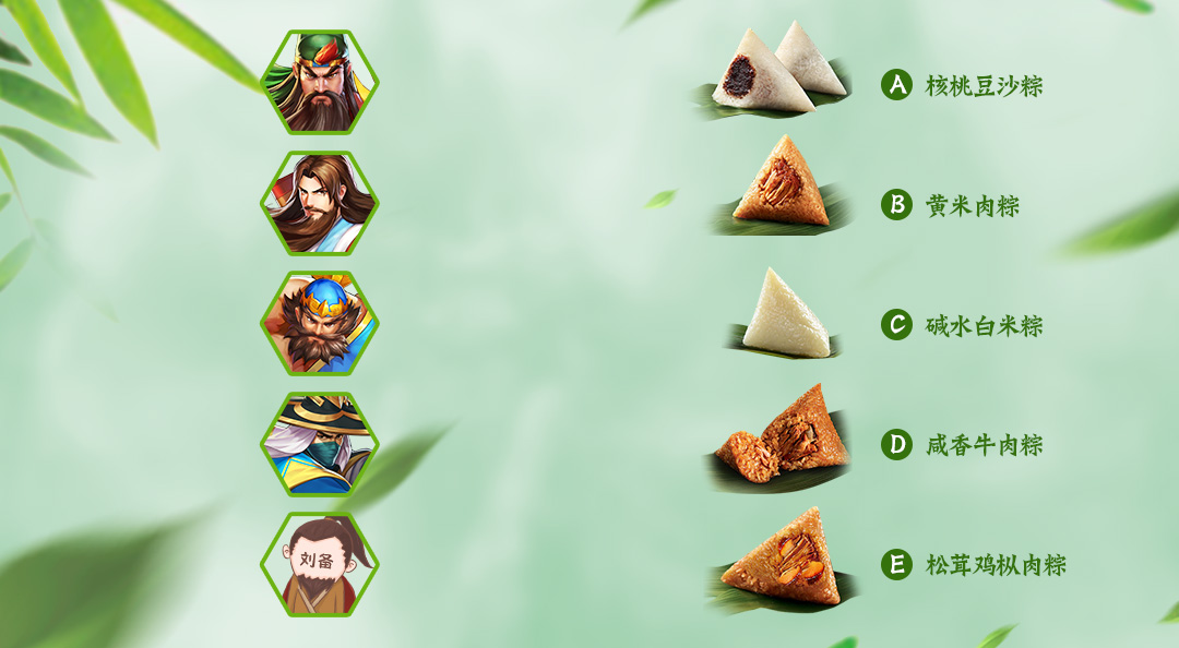 端午将至 ,三国酒肆推出了各种口味的粽子,各地寻粽香而来的客人络绎不绝。是日,酒肆中迎来了一批“大人物”。店小二能否根据各位“老饕”的喜好提供令人满意的粽子呢?各位机智的主公不妨来帮帮他吧!