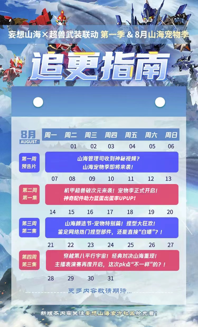 8月第4周山海内会再重现超兽名场面的经典对决,同时我们会有配套的主播策划娱乐赛,至于直播形式嘛……先卖一个小关子,但我能保证会是大家之前没见过的新形式。