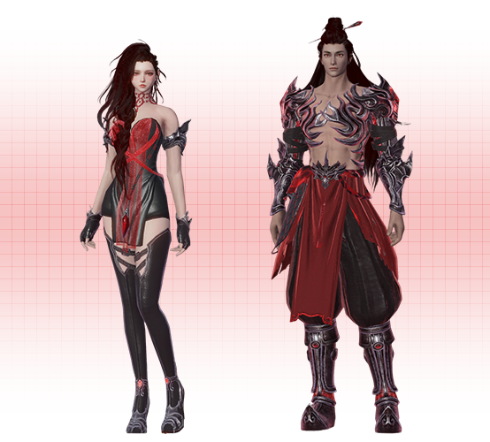 红品女装·红绫碎玉为黑色连身皮甲短裤,红纱遮掩,红色拖尾,整体层次分明,更具设计感。血玉鎏晶从领口攀附而上,簇状血晶自护甲中长出,燃起暗红的火焰,搭配发间生长的晶石,为角色增添了一丝妖冶如火的气质,辅以高扎着的蝎尾发辫,更是显现出不一样的利落英气。