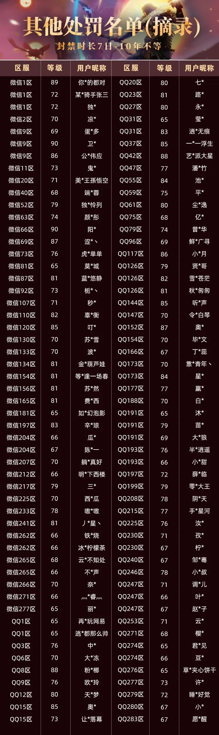 经统计,山海五月累计封号处罚账号35466个,其中136个账号已被采取全区封禁十年的顶格处罚,以下为五月经官方核实后给予封禁十年处罚的账号信息(部分摘录):