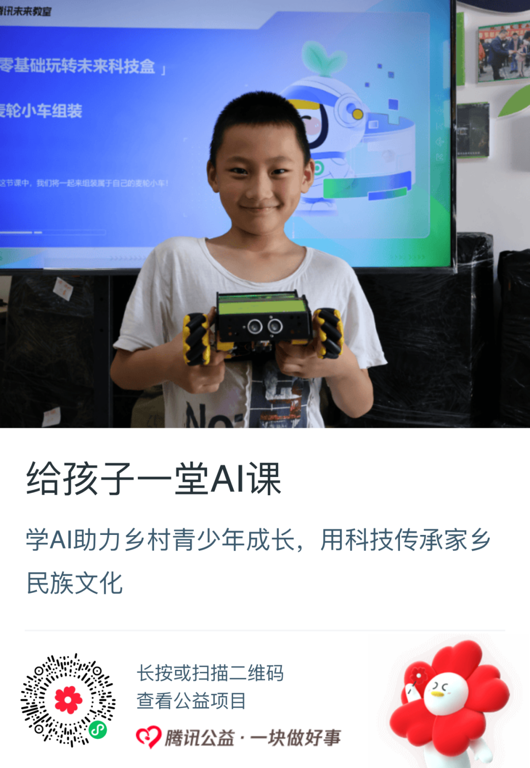 正是基于这份“用科技赋能未来”的初心,“给孩子一堂AI课”项目助力欠发达地区学校适应AI潮流,为师生提供人工智能教具、课程、赛事培训等支持。而我们妄想山海携手腾讯成长守护、四川省科技公益发展基金会,在此呼吁大家一起关心青少年成长,为乡村孩子的梦想添一束光。