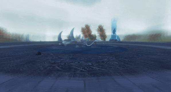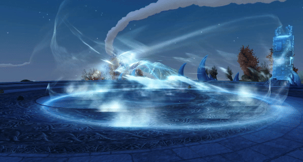 原地快速的向前回旋三周蓄力,短暂停顿后反方向旋转后退并旋出一个巨大的风刃刀光劈开地面引起风与水的喷发造成大量伤害(近程伤害)