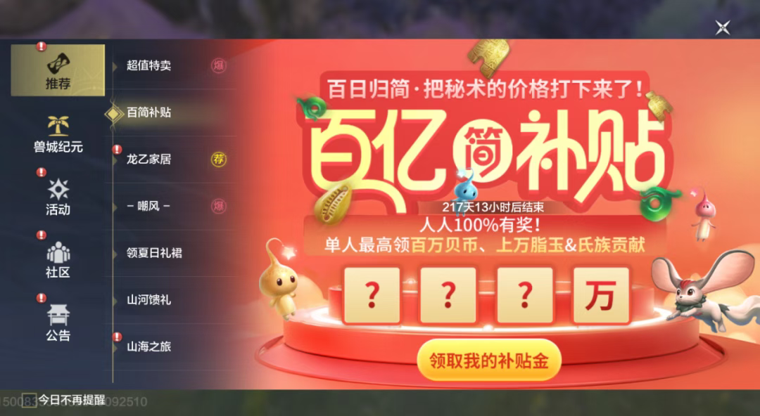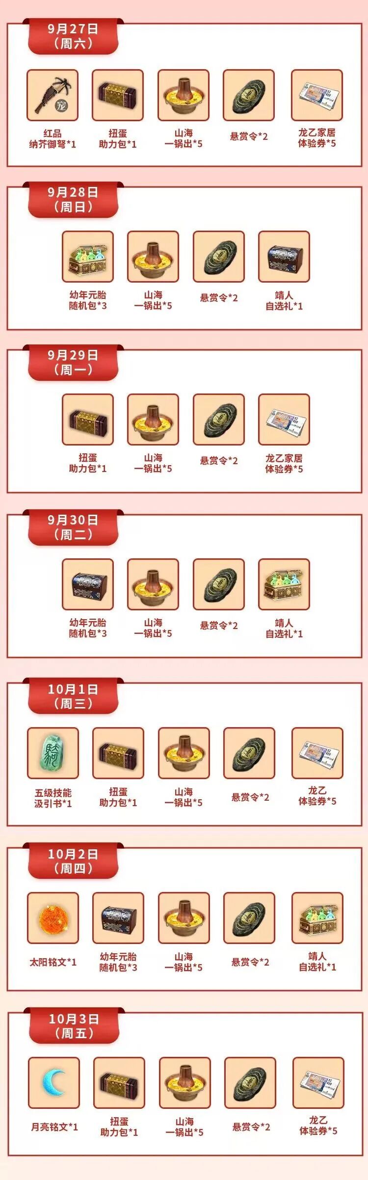 金秋好礼七连送,每天通过邮件送出一份好礼,涵盖宠物养成必备的山海一锅出、抽取新家具的抽奖券等等...仅限当日领取哦!