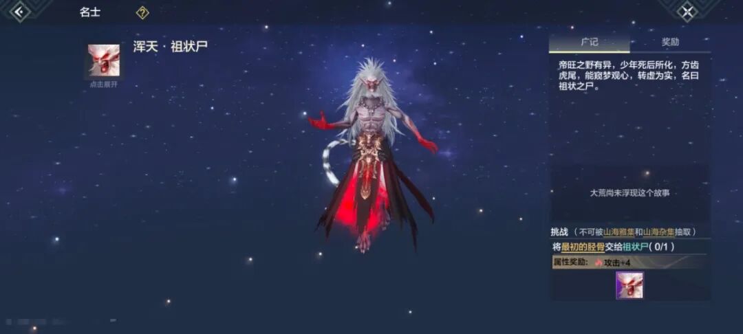 首次完成传说之主·祖状尸挑战,还可获得剧情兑换道具【最初的胫骨】(每个角色仅可获得一次),可在祖状尸处兑换一次性奖励,并解锁【山海经-名士-传说-浑天·祖状尸】成就,获得祖状尸头像、火攻击+4。