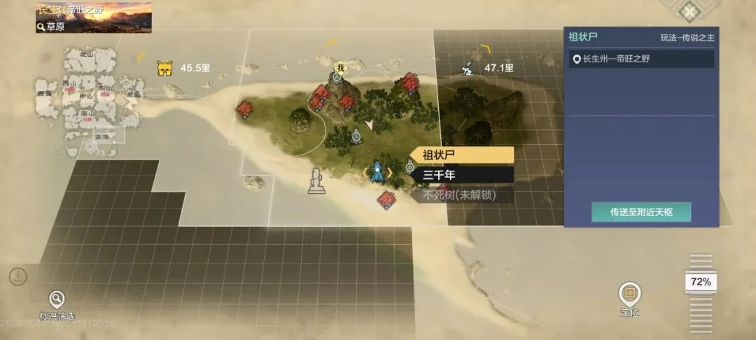 传说之主挑战未开启时,祖状尸会在南海东北部的【长生州-帝旺之野】以自我保护的姿态存在,每日20:00、每周六周日中午12:30可能化出分身进行战斗。
