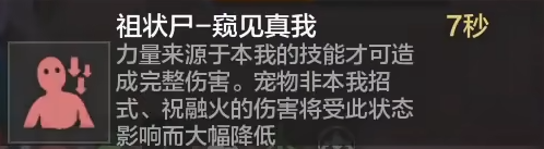 ● 机制:祖状尸开局10分钟内会自带“窥见真我”状态,力量来源于本我的技能才可造成完整伤害。宠物非本我招式伤害、祝融火继承的属性将大幅降低。