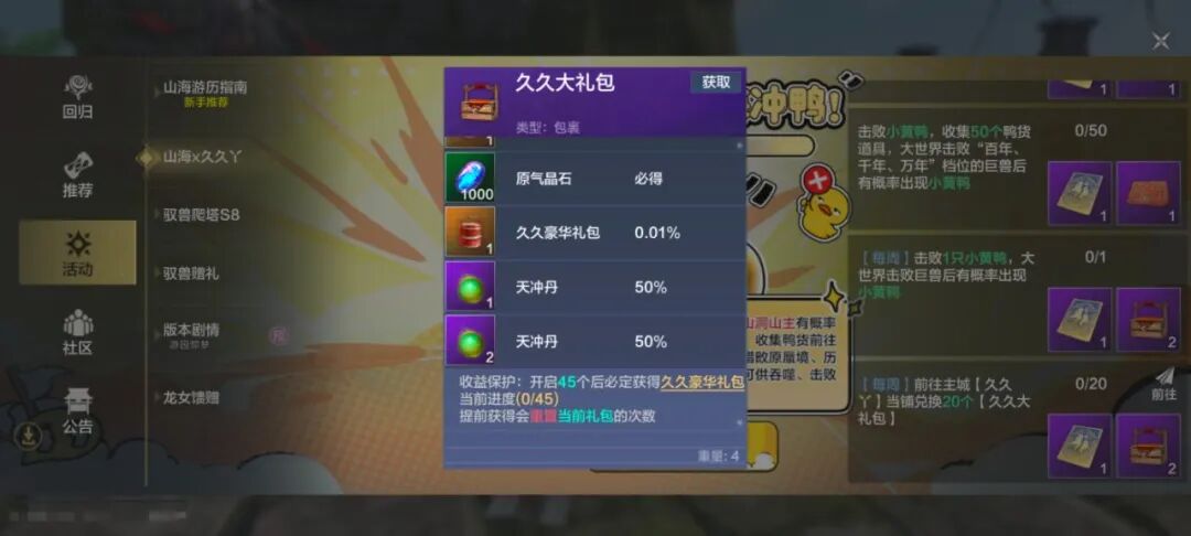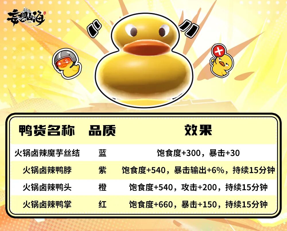 活动期间,击败大世界巨兽/山洞山主时,有概率额外刷新小黄鸭巨兽!年份越高,掉落高品质鸭货概率越大!山洞内掉落的鸭货品质还会更高一档哦!
