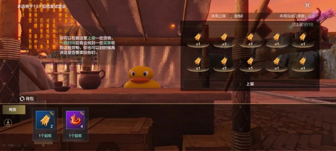 随久久丫一起将好吃的鸭货卖向全大荒吧!角色等级满30级且战力超过25000的旅者,即可前往主城久久丫邸店提交鸭货,兑换久久丫大礼包!鸭货品质越高,兑换的礼包越多!
