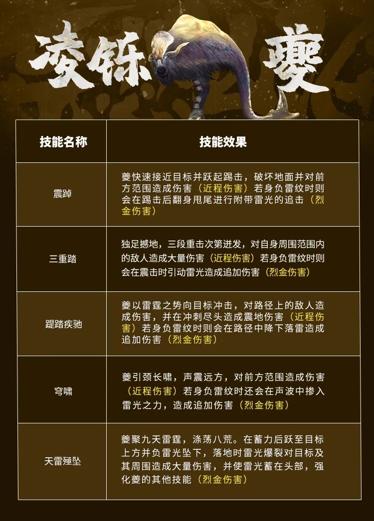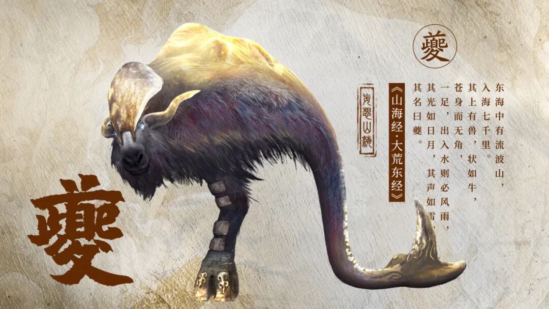 “它的体型庞大如山峦,通体覆盖苍青色的厚重皮毛,仅以一只粗壮无比的独足立于大地,足上可见古老的金色纹路。据传说,每当其行动或咆哮时,周遭便风雨大作,雷电交加,威势足以撼天动地。”