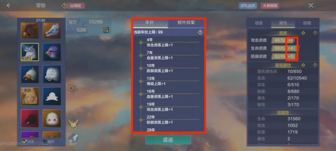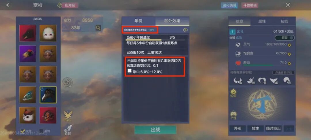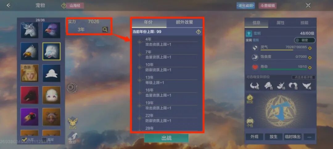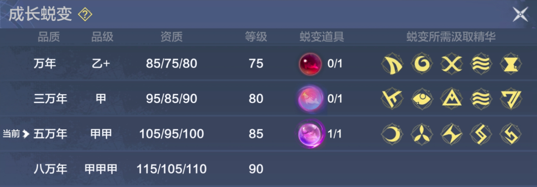但要注意,小年份最高可提升至蜕变年份前一年,无法直接突破当前阶段。例如,百年巨兽最多提升至999年,蜕变后才会变为1000年,获得完整的千年巨兽资质、等级上限。