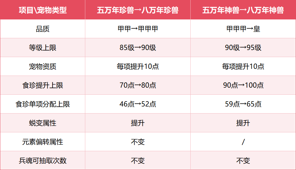 宠物从五万年提升至八万年后,各方面属性都有较大变化,根据珍兽、神兽的不同,各项提升项目有所不同,另有部分内容不会随着年份提升而改变。