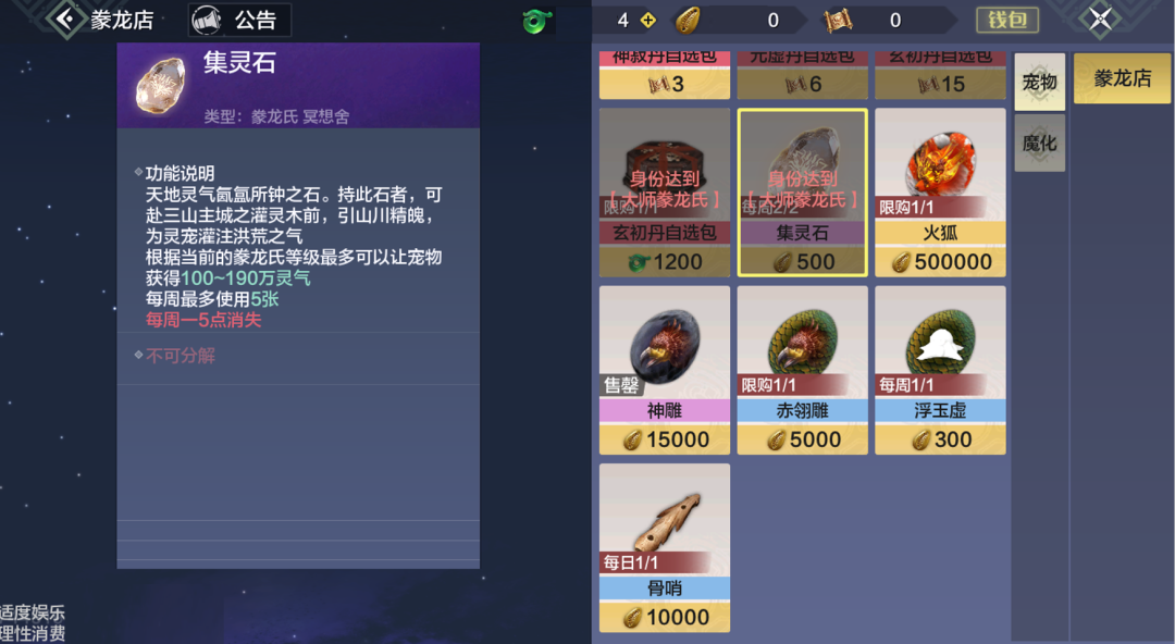 ● 每个集灵石挂机时长为2小时,中途取出宠物,按已挂机时长结算经验,退还完全未开始使用的集灵石和次数(跨周时,不返还上周用的门票和cd次数)