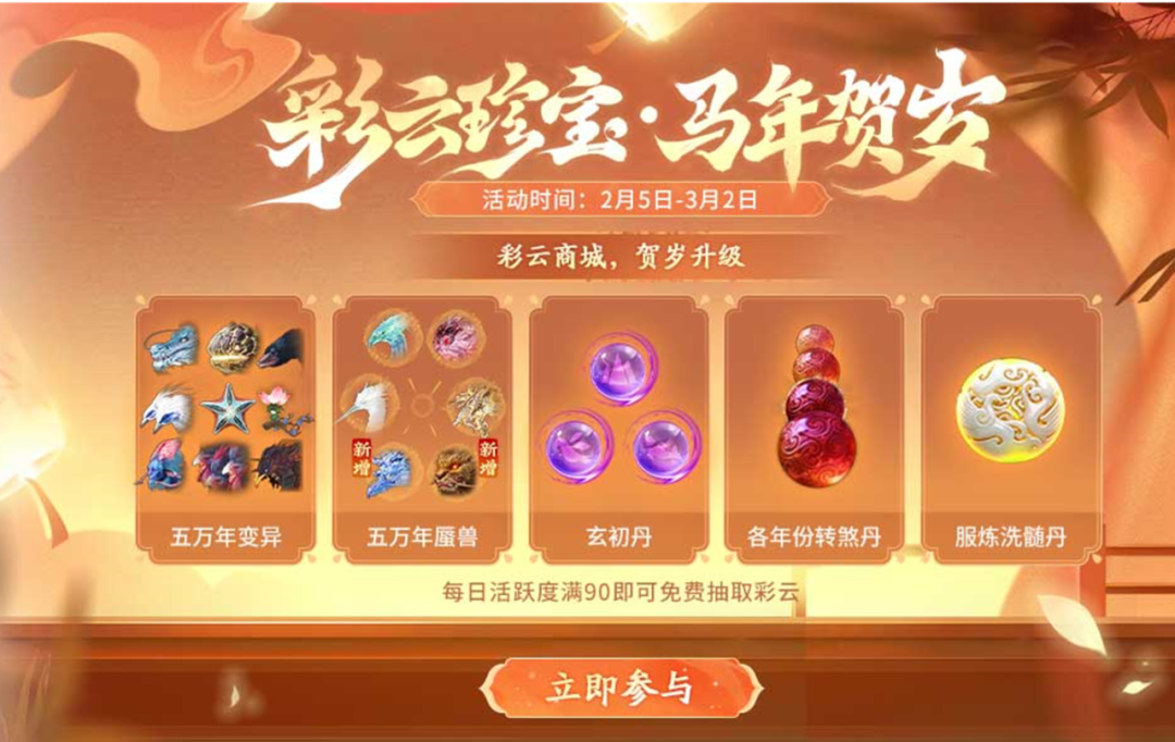 “碎云珍宝”即将全新升级为“彩云珍宝”!可获得五万年蜃兽变异卡、用于服炼洗点的“洗髓丹”、转煞丹等实用好物上新!