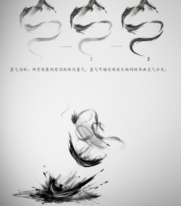 负屃技能将围绕水墨风展开,加入泼墨、墨气、毛笔、墨染等视觉元素,墨笔挥洒,尽抒天地。