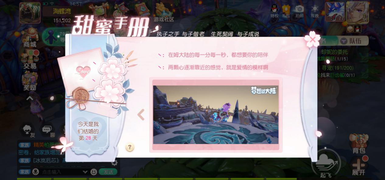 《梦想新大陆》中,夫妻功能日趋完善,夫妻双方终于可以进行每日互动的情侣任务了。情侣任务难度较低,答题、赏月和捕捉萤火虫等,轻轻松松就能得到经验、金币和亲密度道具等奖励。