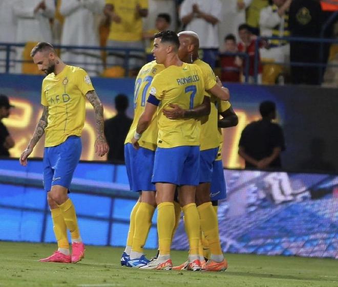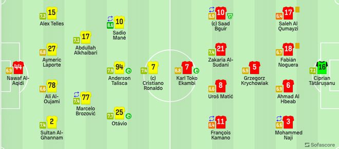 利雅得胜利首发:44-阿奇迪、2-哈纳姆、78-奥贾米、27-拉波尔特、15-特莱斯、17-哈巴利、25-奥塔维奥、77-布罗佐维奇(80'6-塞科-福法纳)、94-塔利斯卡、10-马内(80'29-阿卜杜勒拉赫曼-加里卜)、7-C罗