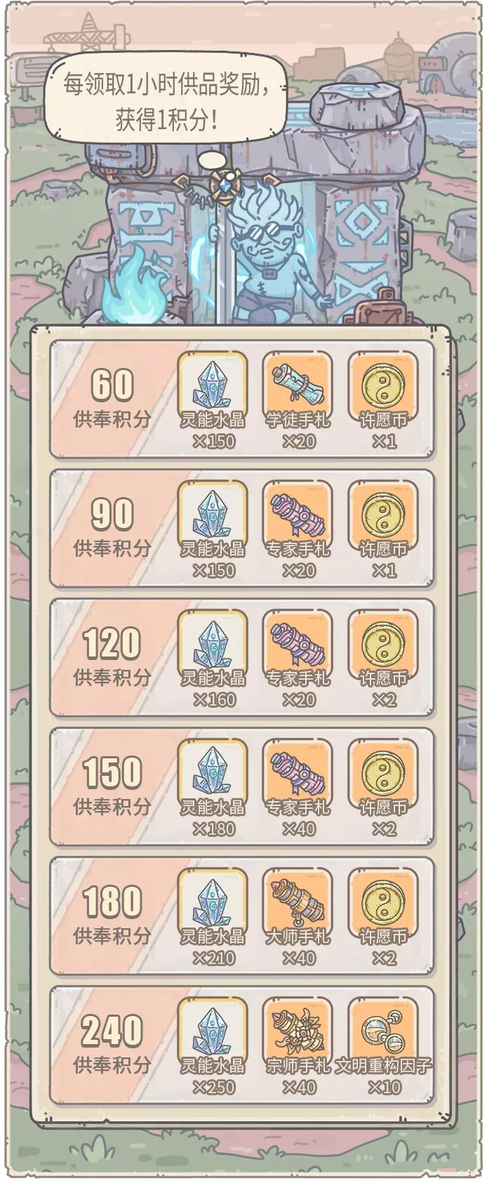 活动期间,每次领取供奉奖励,根据祭品原始的供奉时间,获得活动积分(1小时=1积分)累积对应的活动积分,可获得以下奖励: