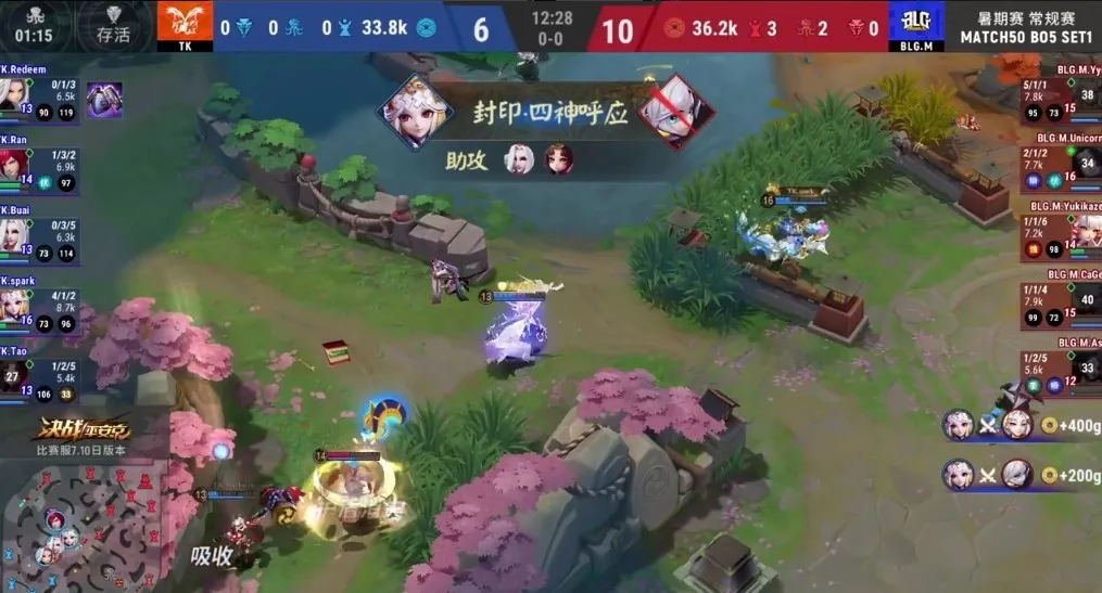 TK与BLG.M在第六周的比赛中拉满五场,双方你来我往,在TK依靠自身韧性成功翻盘先下一城后,BLG.M立刻用极致的运营战术抢下后面两局的胜利。而TK不急不躁,第四局利用小松丸与鬼使白的搭配体系让BLG.M步步受阻,而最终的决胜局,TK的御馔津成为名副其实的伤害制造机,带领队伍赢下比赛!
