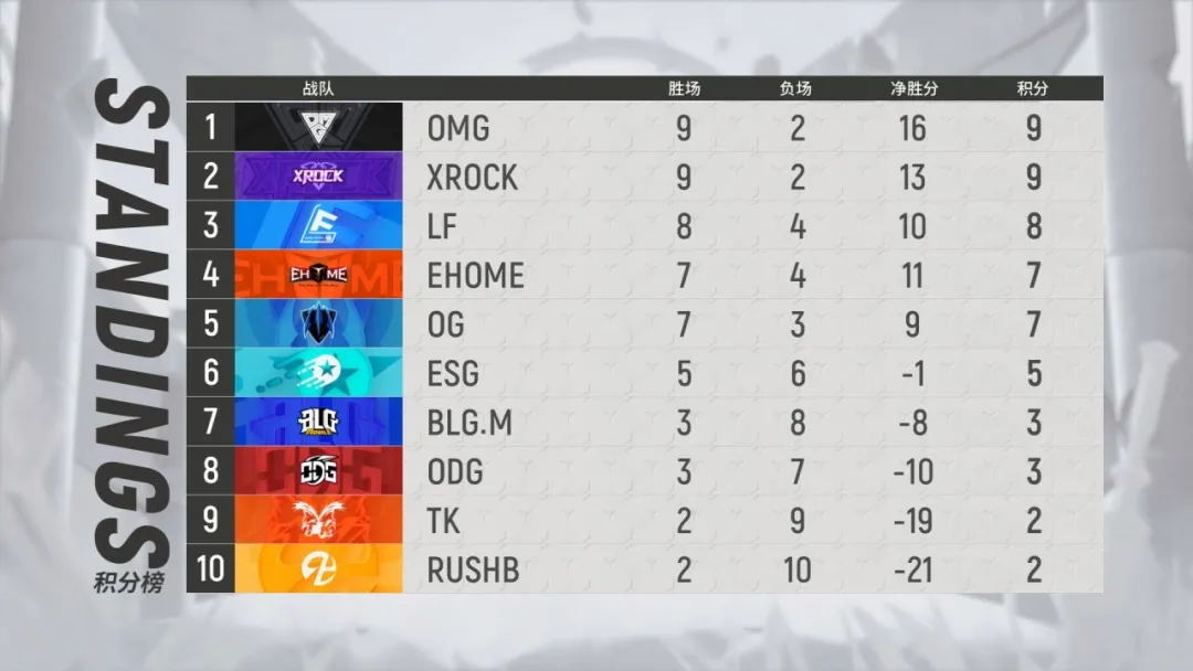 从第六周赛果来看,EHOME成功击败XROCK,后者遗憾止步九连胜;TK、RUSHB终于亮剑,均以3:2惊险小胜BLG.M;而LF也终于觉醒战魂,本周连胜三场击败XROCK、RUSHB、OMG。OPL无弱旅,每个战队都展现出了自己的进步成长,保持已久的排名情况即将被打破。